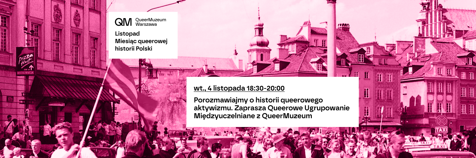 Zapraszamy na opowieść o pierwszych polskich paradach, organizacjach, manifestacjach. Wspólnie przyjrzymy się początkom naszego queerowego ruchu z perspektywy zaangażowanego aktywizmu. Jest to pierwsze z wielu nadchodzących spotkań, organizowanych wspólnie przez QueerMuzeum Warszawa i QUM Queerowe Ugrupowanie Międzyuczelniane. Dyskusję poprowadzi Krzysztof Kliszczyński - dyrektor Muzeum. Spotkanie odbywa się w ramach obchodów Miesiąca queerowej historii Polski. |